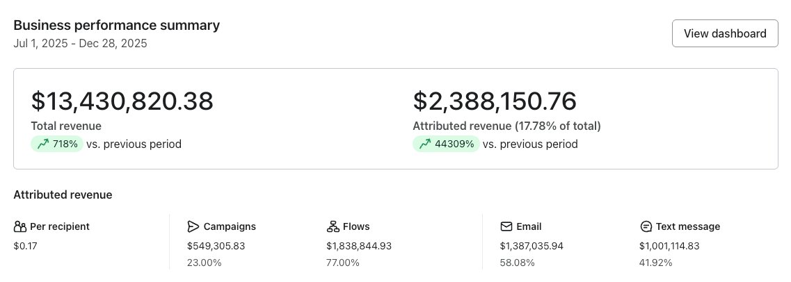 Screenshots from real client accounts — Klaviyo, Shopify, and Google Search Console. These are the numbers we are proud of.